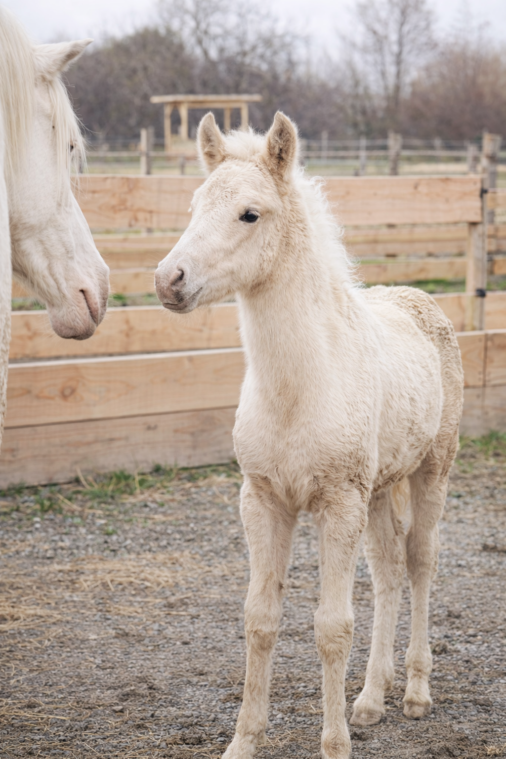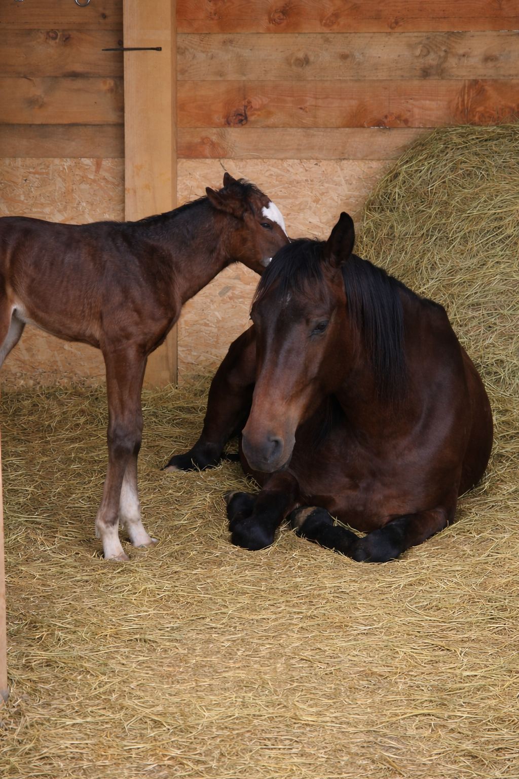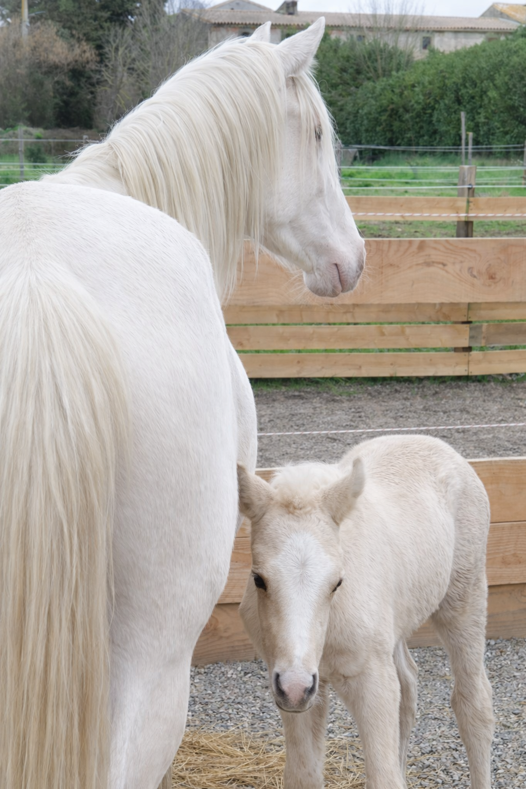 Aux Jardins de Kyra, nos juments ne sont jamais enfermées seules. Même au moment de la mise bas, elles peuvent choisir de pouliner dans un box ouvert sur le paddock, situé à l’intérieur du pré, ou bien de s’isoler tout en conservant le contact visuel avec les autres congénères.