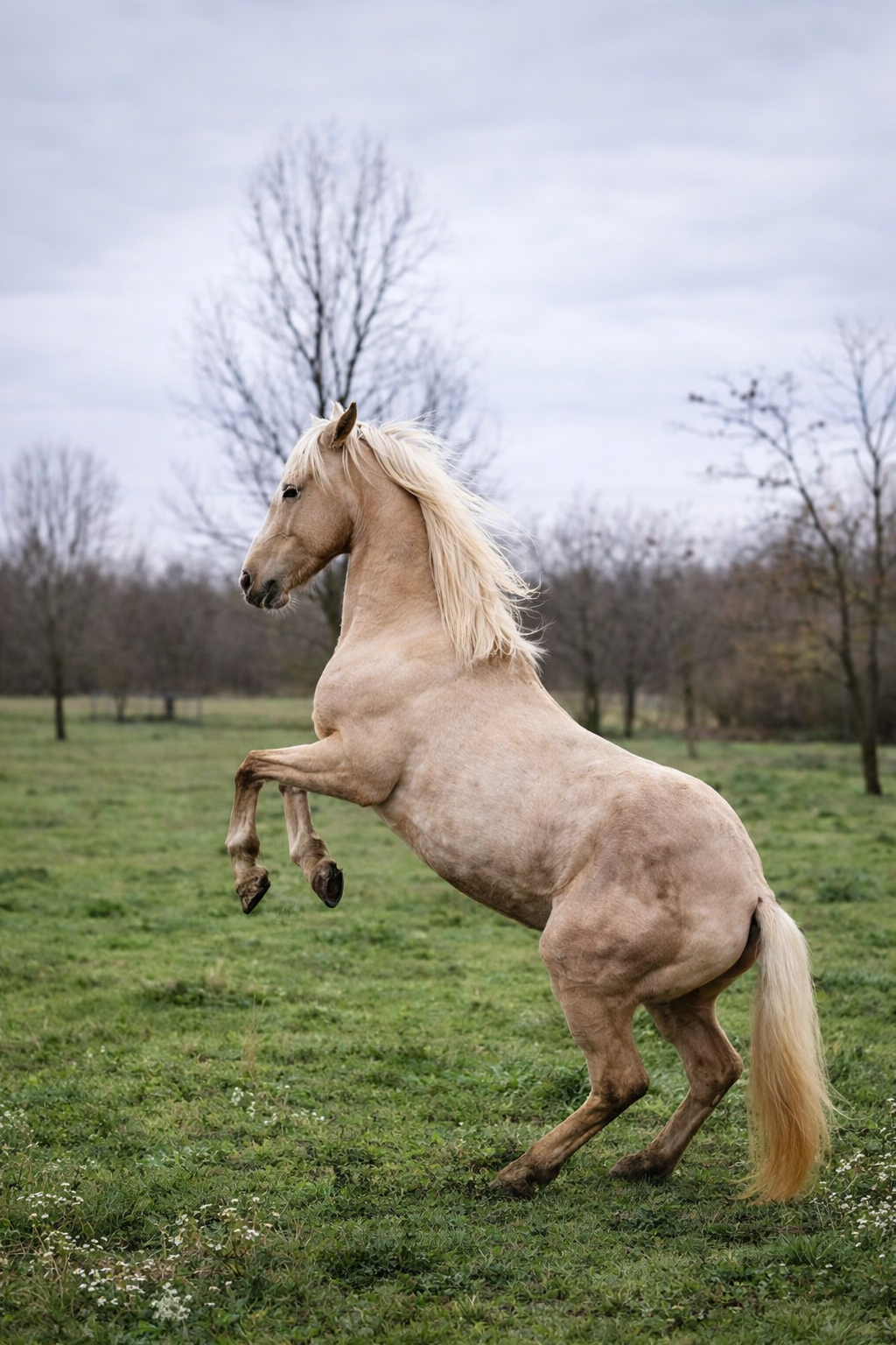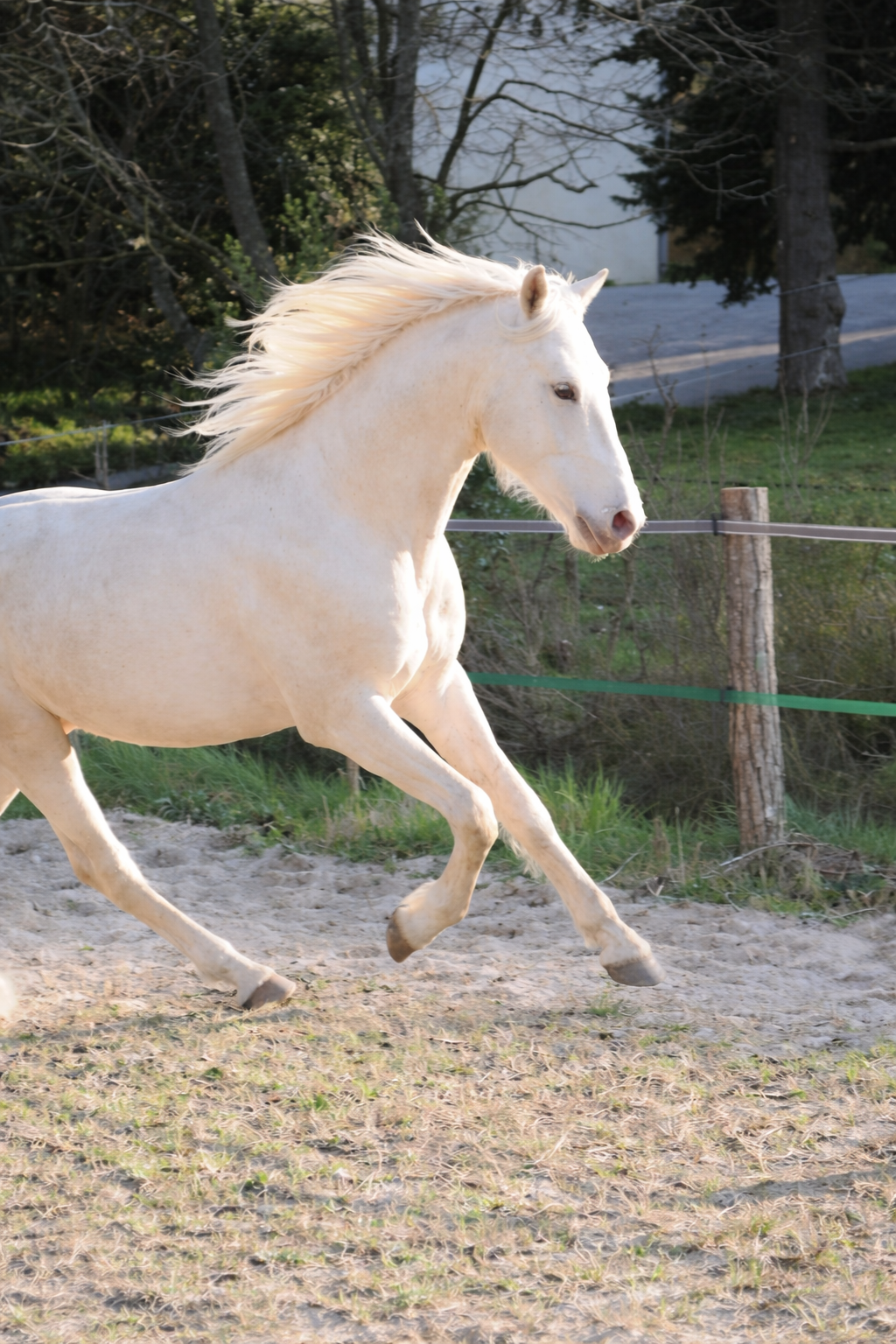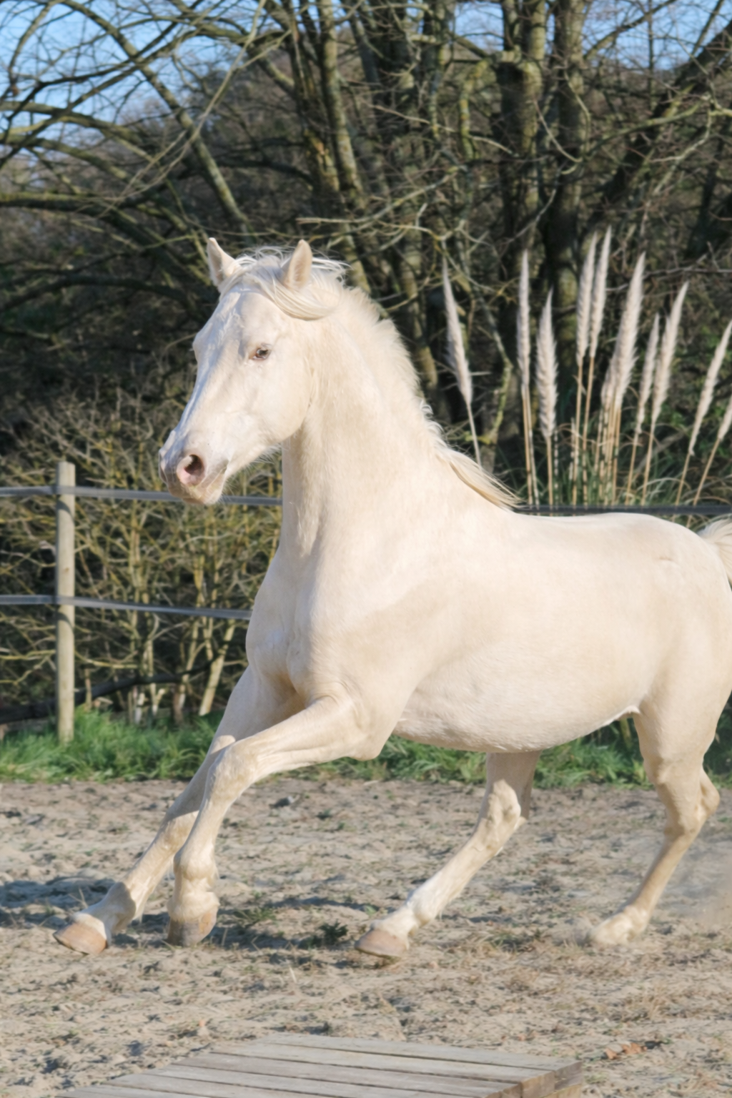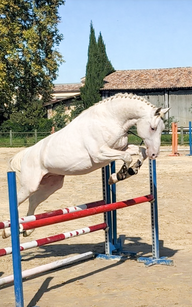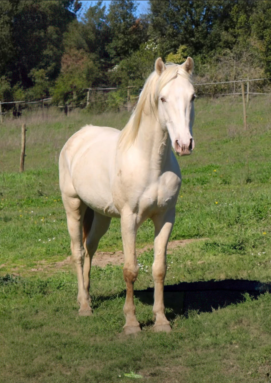 Belle jument très typée baroque espagnol cremello aux yeux bleus, elle transmet à ses poulains sa finesse et son élégance. Sa descendance serait parfaite pour le dressage, le travail à pied, le show et pourquoi pas, selon les envies, une carrière plus sportive.