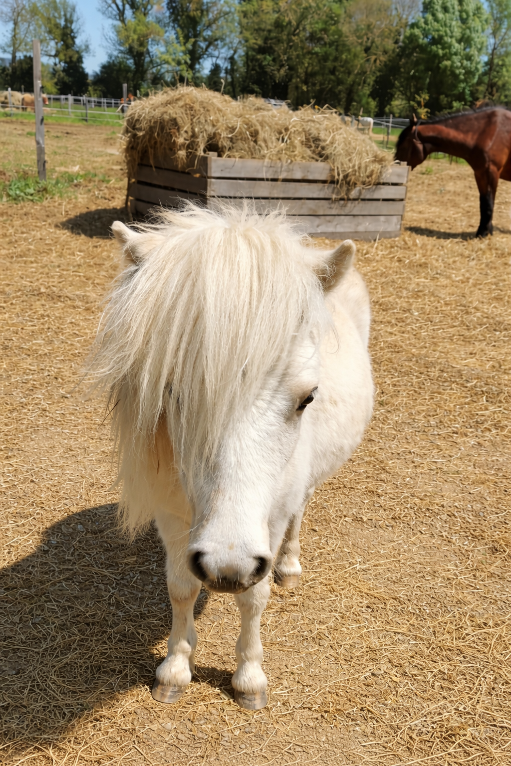 C’est précisément pour cette raison que, Aux Jardins de Kyra, nous faisons le choix de proposer du foin à volonté. Le foin constitue une source essentielle de fibres, indispensable au bon fonctionnement digestif de l’équidé. Chez nous, ce foin n’est pas contenu dans un filet, et plusieurs points de fourrage sont proposés au sein d’un même groupe d’équidés, afin de respecter à la fois les besoins alimentaires et les équilibres sociaux du troupeau.