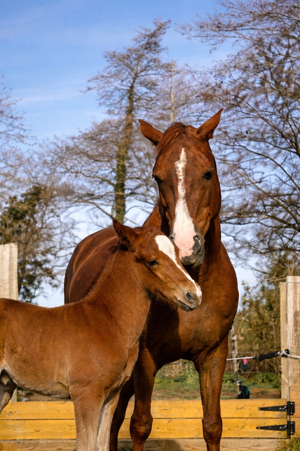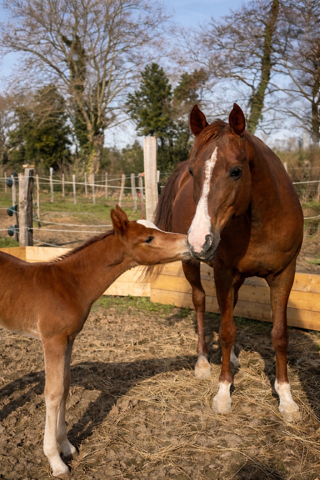 Le premier repère du poulain reste bien sûr sa mère. Son meilleur apprentissage passe par elle. C’est pourquoi Les Jardins de Kyra mettent un point d’honneur à laisser la poulinière au sein de son troupeau le plus tardivement possible avant la mise bas. Nous privilégions des box ouverts sur paddock, installés au milieu du troupeau, afin que les poulinières puissent continuer à bénéficier du contact visuel et olfactif avec les autres chevaux.